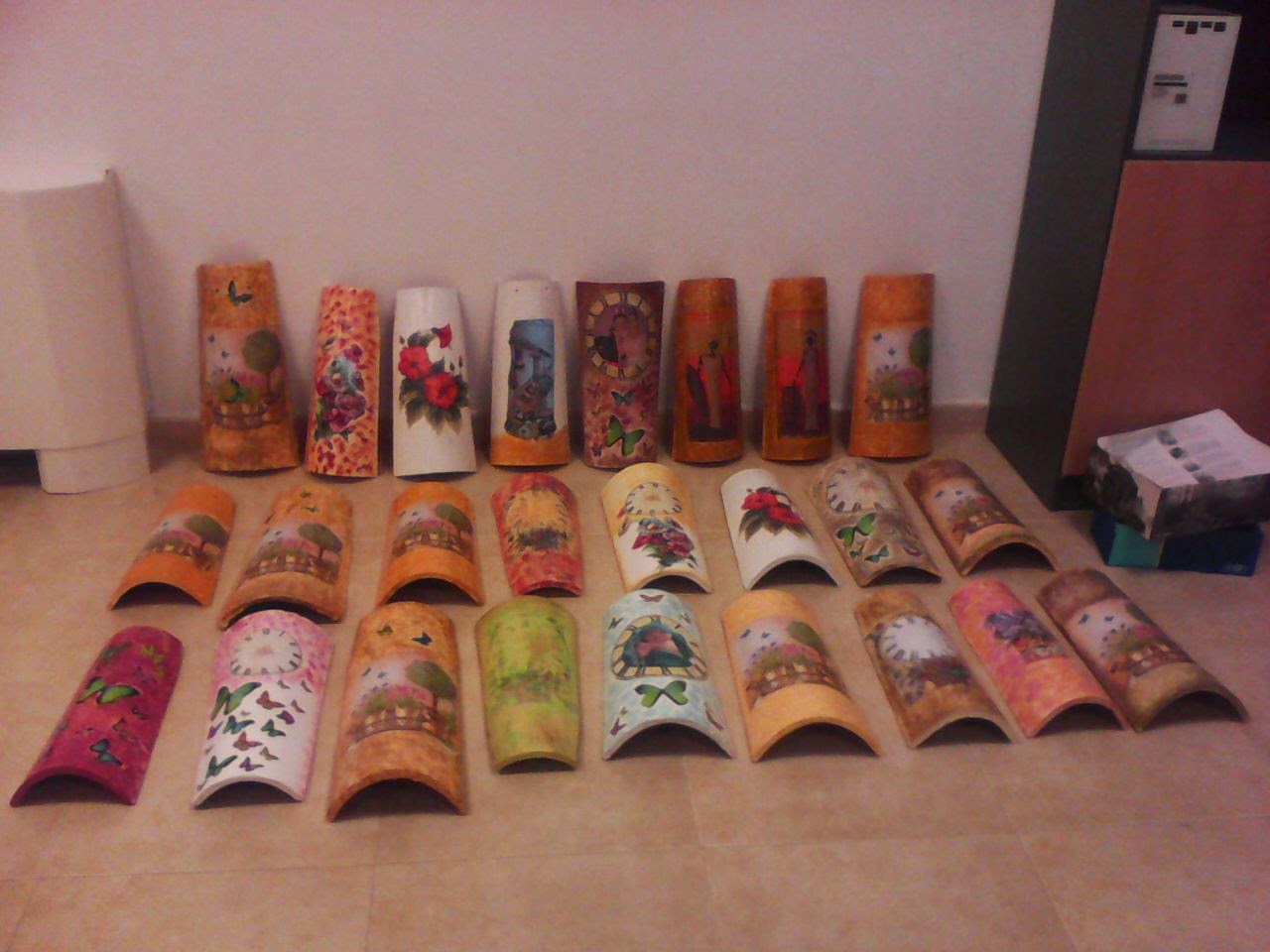 Aquí las tejas de un taller de tajas , están todas realizadas en Decoupage. Espero que os gusten , yo creo que son preciosas y mas siendo las primeras que hacen no os parece?